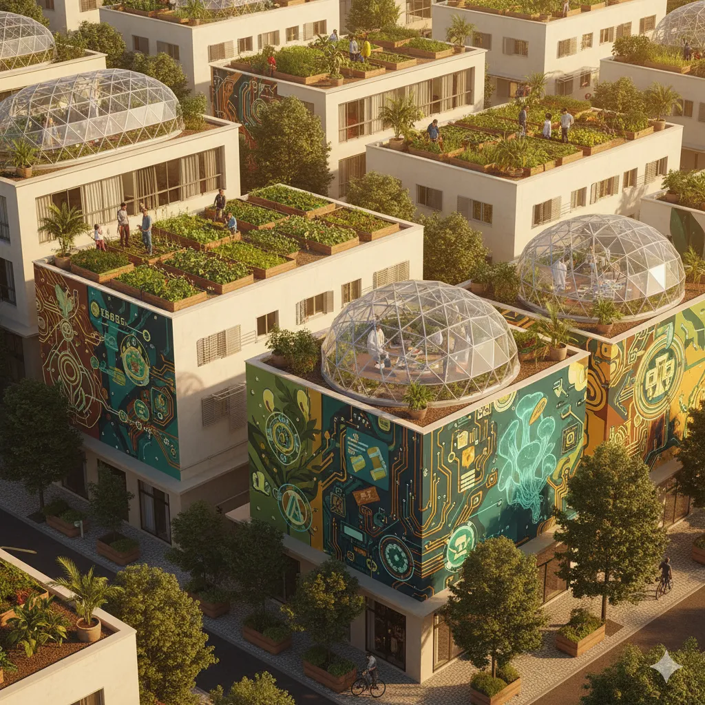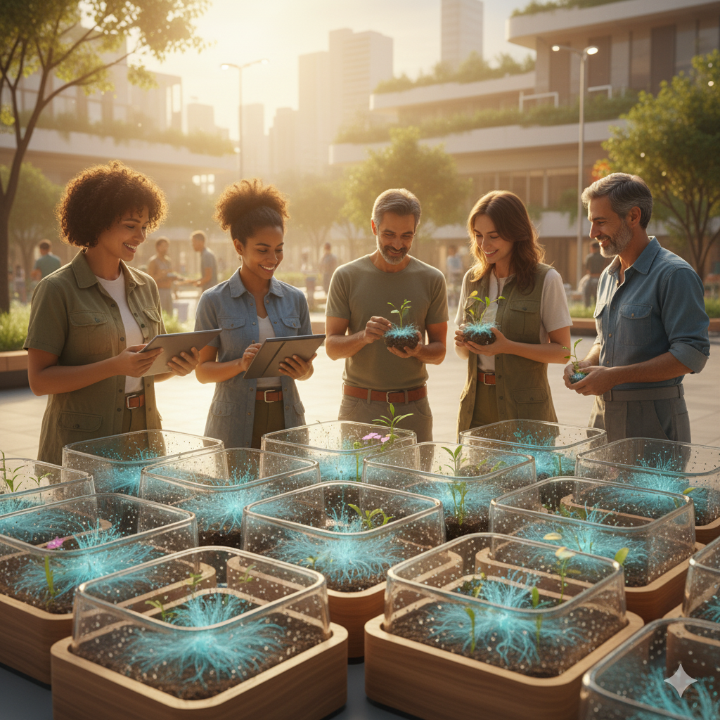 Em São Paulo, o cenário industrial se reinventa pela bioarquitetura e pelo reaproveitamento. Casas e escolas são construídas com materiais reciclados, equipadas com painéis solares e sistemas de captação de chuva. O antigo estádio de futebol se transforma em um centro de energia e cultivo de espécies nativas. Onde o solo ainda guarda vestígios de contaminação, cientistas cidadãos utilizam fungos que decompõem resíduos tóxicos e devolvem vida ao ambiente. Cada micélio cultivado é um gesto simbólico de reconstrução, uma aliança entre ciência e esperança.