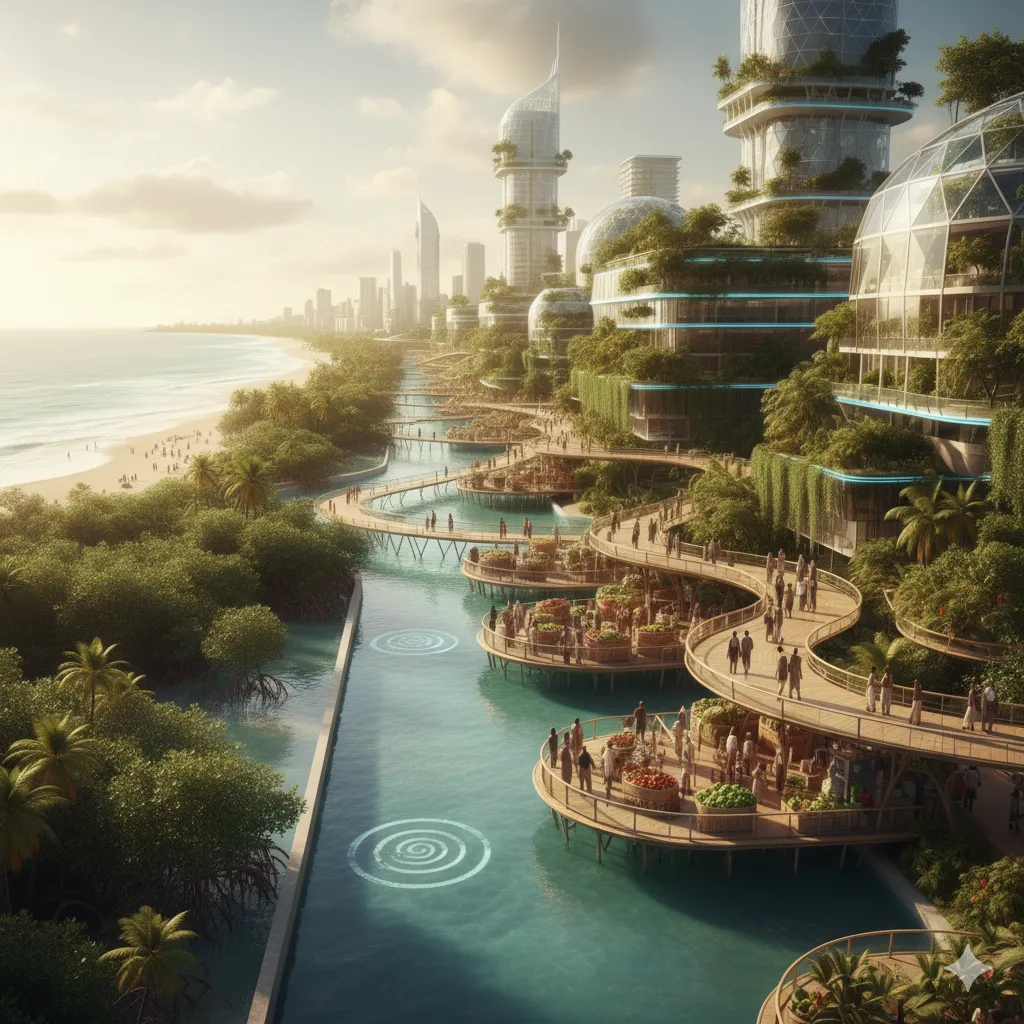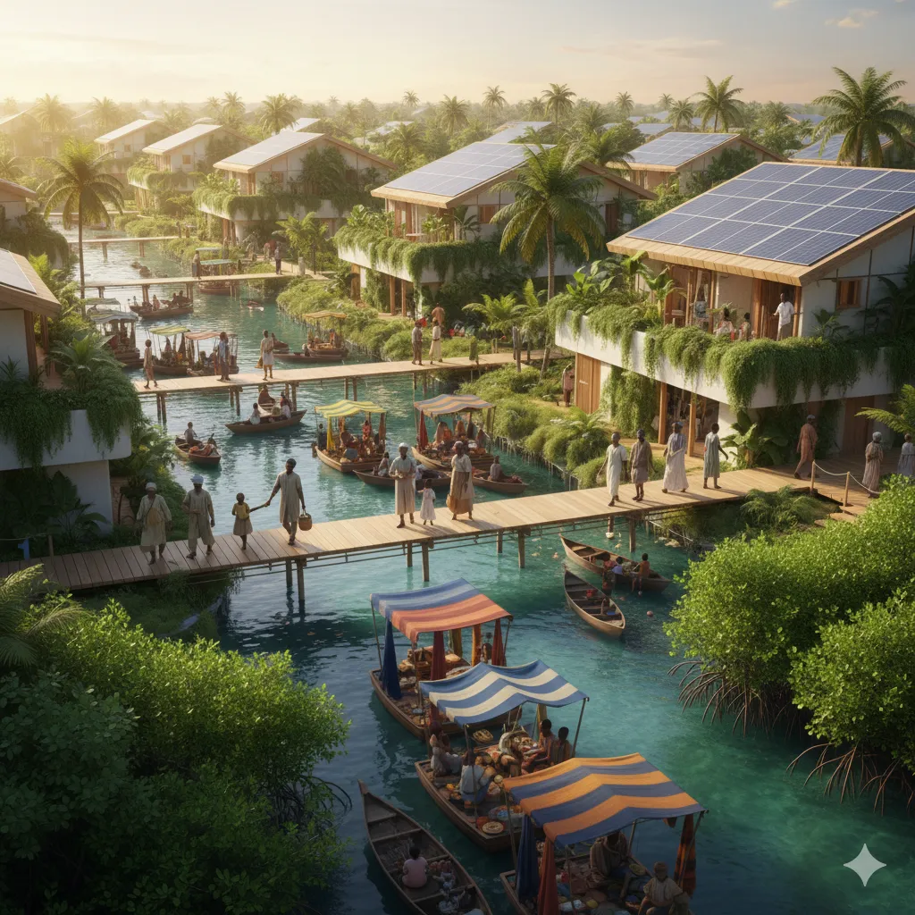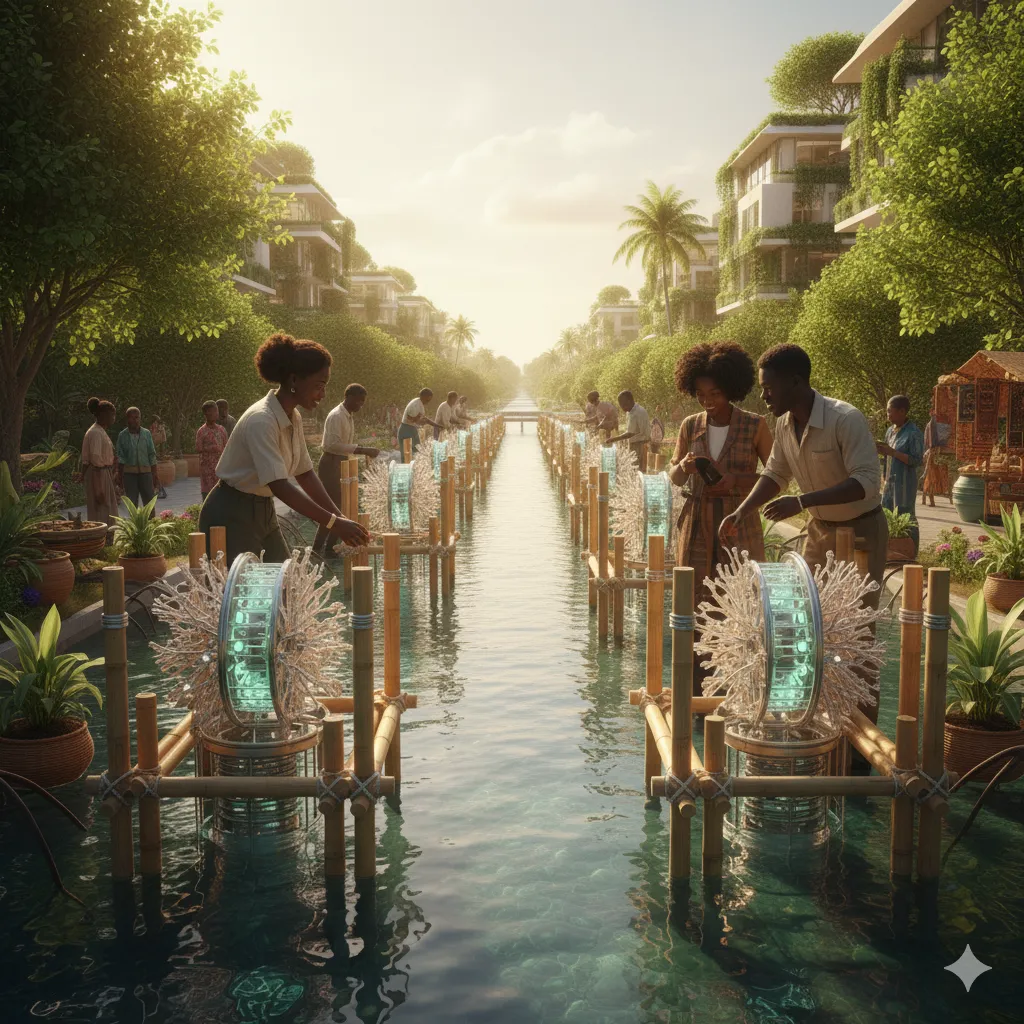 Lagos, na Nigéria, aparece como um exemplo de reconciliação com o próprio território. Após décadas de erosão, a cidade restaura seus manguezais e transforma os canais em fontes de energia. Tubulações com microturbinas convertem o movimento da água em eletricidade que ilumina mercados e escolas. O mangue, antes símbolo de abandono, passa a ser um motor econômico e ecológico. Ele fornece pigmentos naturais para tecidos, matéria-prima farmacêutica e abrigo para aves e peixes que voltam a povoar a costa.