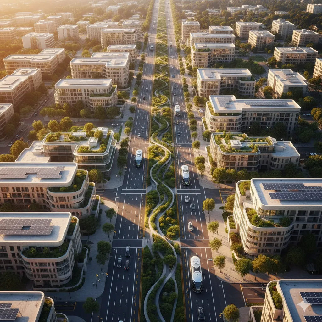 Los Angeles é o primeiro destino dessa visão. A cidade abandona o asfalto dominado por carros e ganha uma malha viva de bicicletas, trens e ônibus elétricos gratuitos. Em troca, os cidadãos contribuem com horas de trabalho comunitário: consertam painéis solares, cultivam hortas urbanas ou compartilham música durante o trajeto. A luz do deserto abastece edifícios agrícolas erguidos sobre antigos estacionamentos, onde frutas e grãos crescem em torres que consomem pouquíssima água.